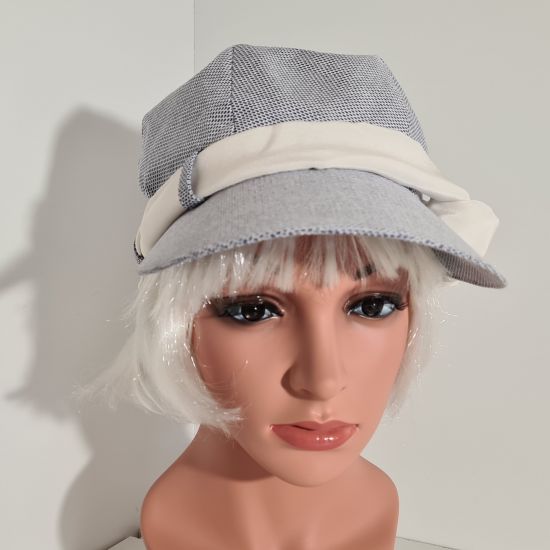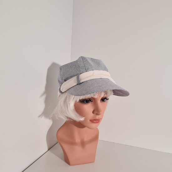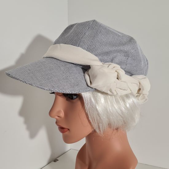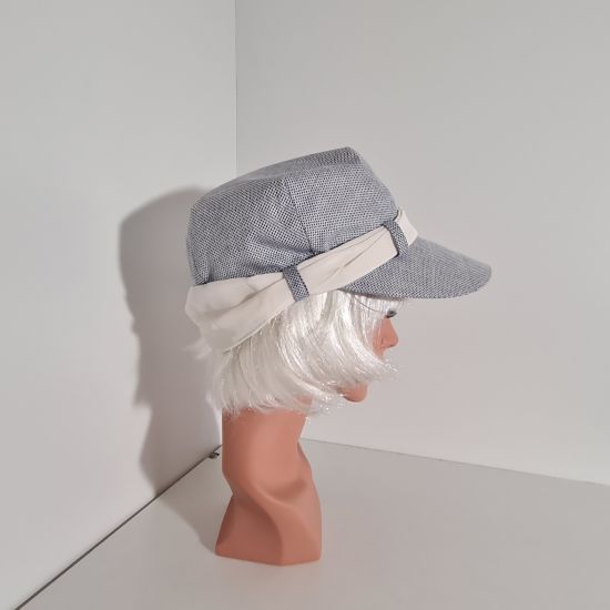 Cette casquette est entièrement réalisé en tissu de coton. Extérieur blanc à reflet bleu. Intérieur sur fond blanc à petit motif bleu. Visière d'environ 8cm. Pour votre plus grand confort, il y a un petit élastique sur l'arrière du chapeau. Possède quatre passants de même couleur que le chapeau. Orné d'un joli foulard de soie en harmonie avec le chapeau (environ 1,10m x 0,20m pouvant varier selon les modèles). Très pratique pour les jours où le temps est plus frais, le foulard se défait pour le passer autour de son cou.