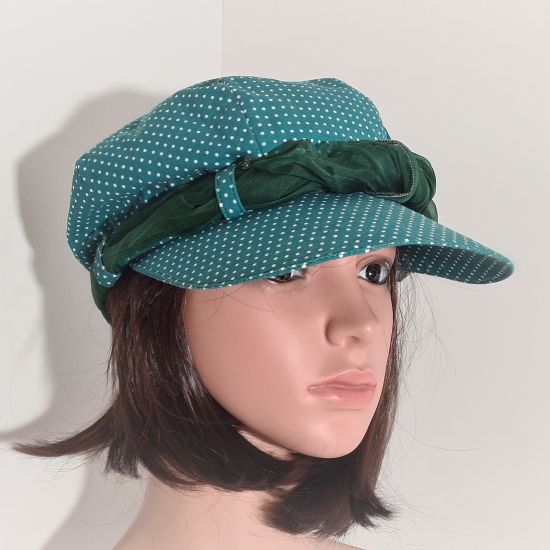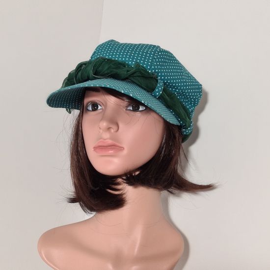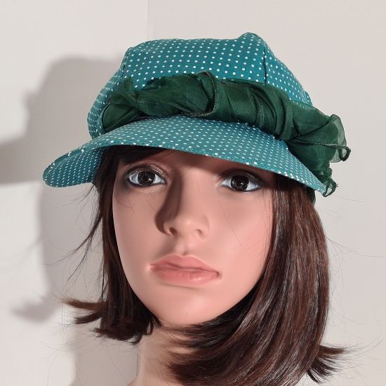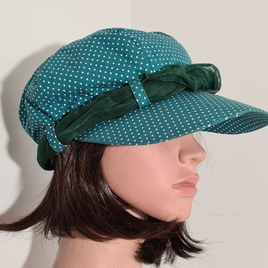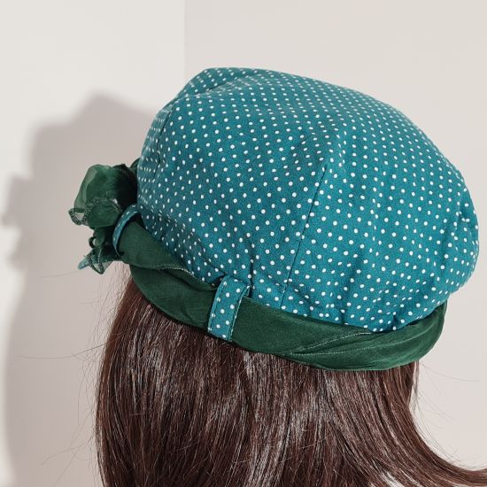 Cette casquette est entièrement réalisé en tissu de coton. Extérieur vert à petits pois blanc. Intérieur vert pomme uni . Visière d'environ 8cm. Pour votre plus grand confort, il y a un petit élastique sur l'arrière du chapeau. Possède quatre passants de même couleur que le chapeau. Orné d'un joli foulard de soie en harmonie avec le chapeau (environ 1,10m x 0,20m pouvant varier selon les modèles). Très pratique pour les jours où le temps est plus frais, le foulard se défait pour le passer autour de son cou.