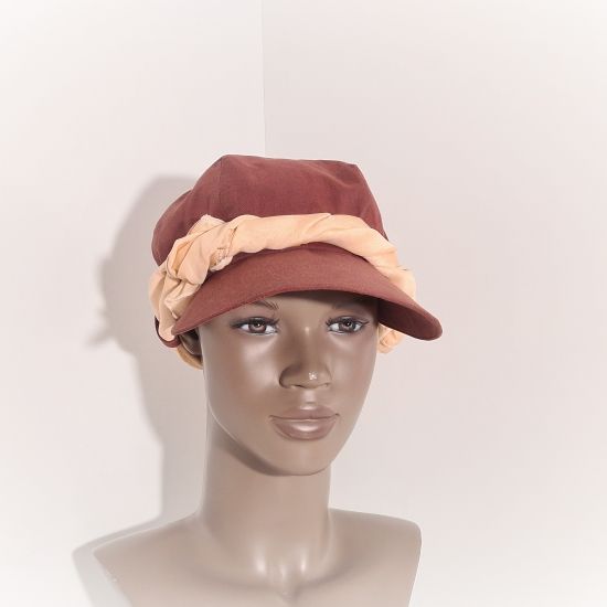 Cette casquette est entièrement réalisé en tissu de coton. Extérieur de couleur ocre uni. Intérieur à motif grain de café. Visière d'environ 8cm. Pour votre plus grand confort, il y a un petit élastique sur l'arrière du chapeau. Possède quatre passants de même couleur que le chapeau. Orné d'un joli foulard de soie en harmonie avec le chapeau (environ 1,10m x 0,20m pouvant varier selon les modèles). Très pratique pour les jours où le temps est plus frais, le foulard se défait pour le passer autour de son cou.