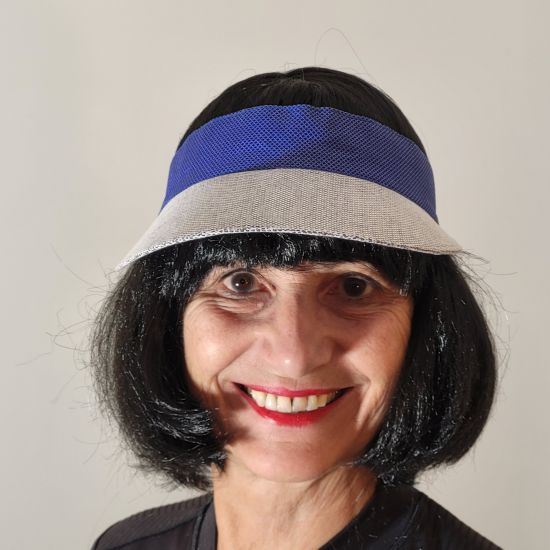 Cette visière est confectionnée en tissu de coton de couleur bleu roi et bleu clair.