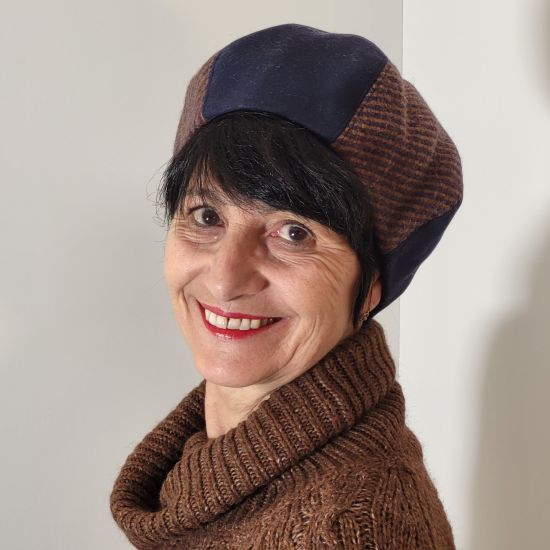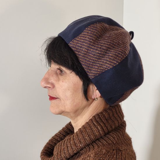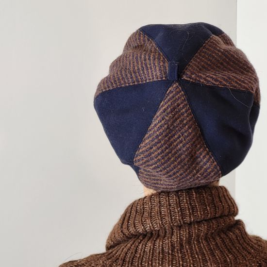 Réalisé en lainage bicolore de couleur bleu marine et marron. Doublé d'un tissu de coton à motif. Au centre, un petit morceau de tissu bleu marine forme le pompon en toute harmonie. Chaud et agréable à porter.