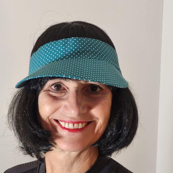 Cette visière est confectionnée en tissu de coton de couleur vert canard à petit pois blanc.