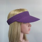 Cette visière est confectionnée en tissu de coton de couleur violet à petit motif blanc.