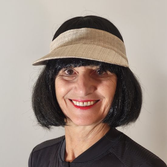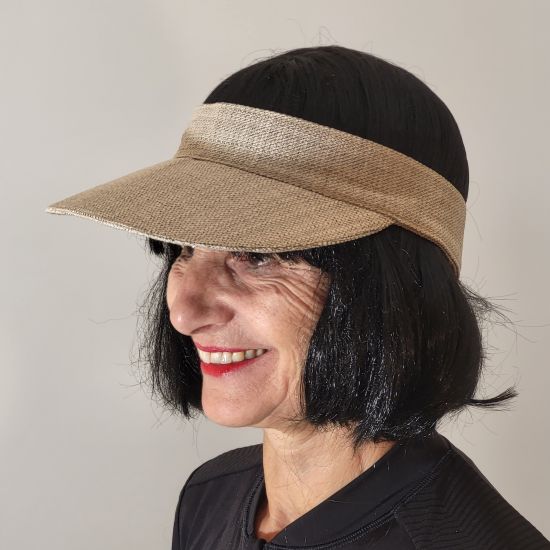 Cette visière est confectionnée en tissu de coton de couleur marron clair.