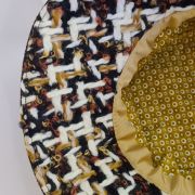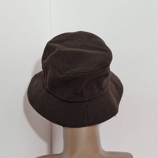 Chapeau réalisé en lainage de couleur Marron. Hauteur de la calotte environ 9 cm bord devant environ 8 cm et l'arrière de 6, 5 cm Orné d'une jolie fleur et de son bouton pour former le cœur en harmonie avec l'ensemble du chapeau. Doublé de coton .