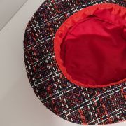 Chapeau réalisé en lainage de couleur rouge. Hauteur de la calotte environ 6.5 cm le bord environ 6.5 cm . Agrémenté d'une fantaisie en harmonie avec l'ensemble du chapeau. Doublé de coton .