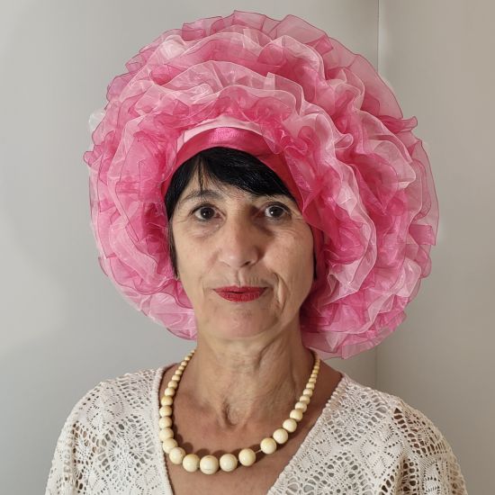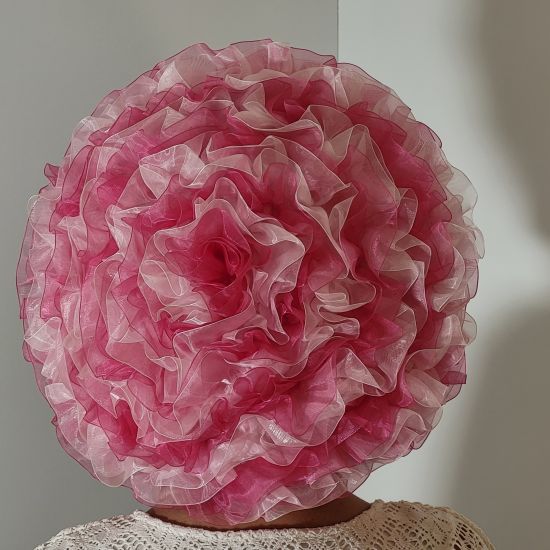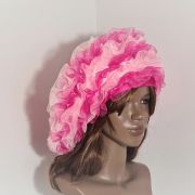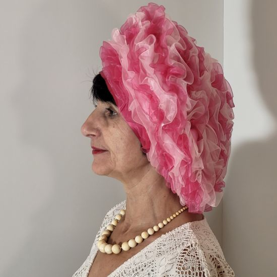 Ce béret est réalisé avec du ruban organdi de deux couleurs roses . Le ruban est froncé et piqué entièrement à la main. Doublé de coton rose pâle.