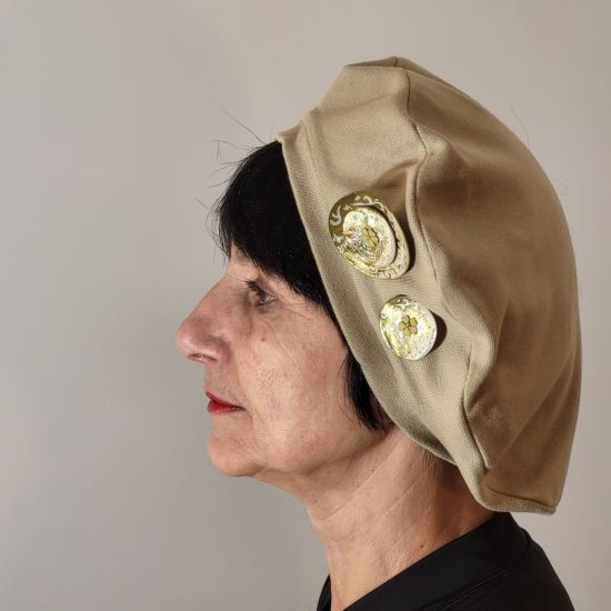 Orné de boutons nacrés agrémenté de fleurs de tissu et de perles.
