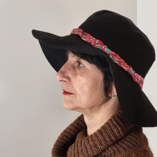 Chapeau réalisé en lainage de couleur noir. Hauteur de la calotte environ 9.5 cm le bord 10 cm environ. un bandeau tressé 5 brins autour du chapeau en harmonie avec l'ensemble du chapeau. Doublé de coton .